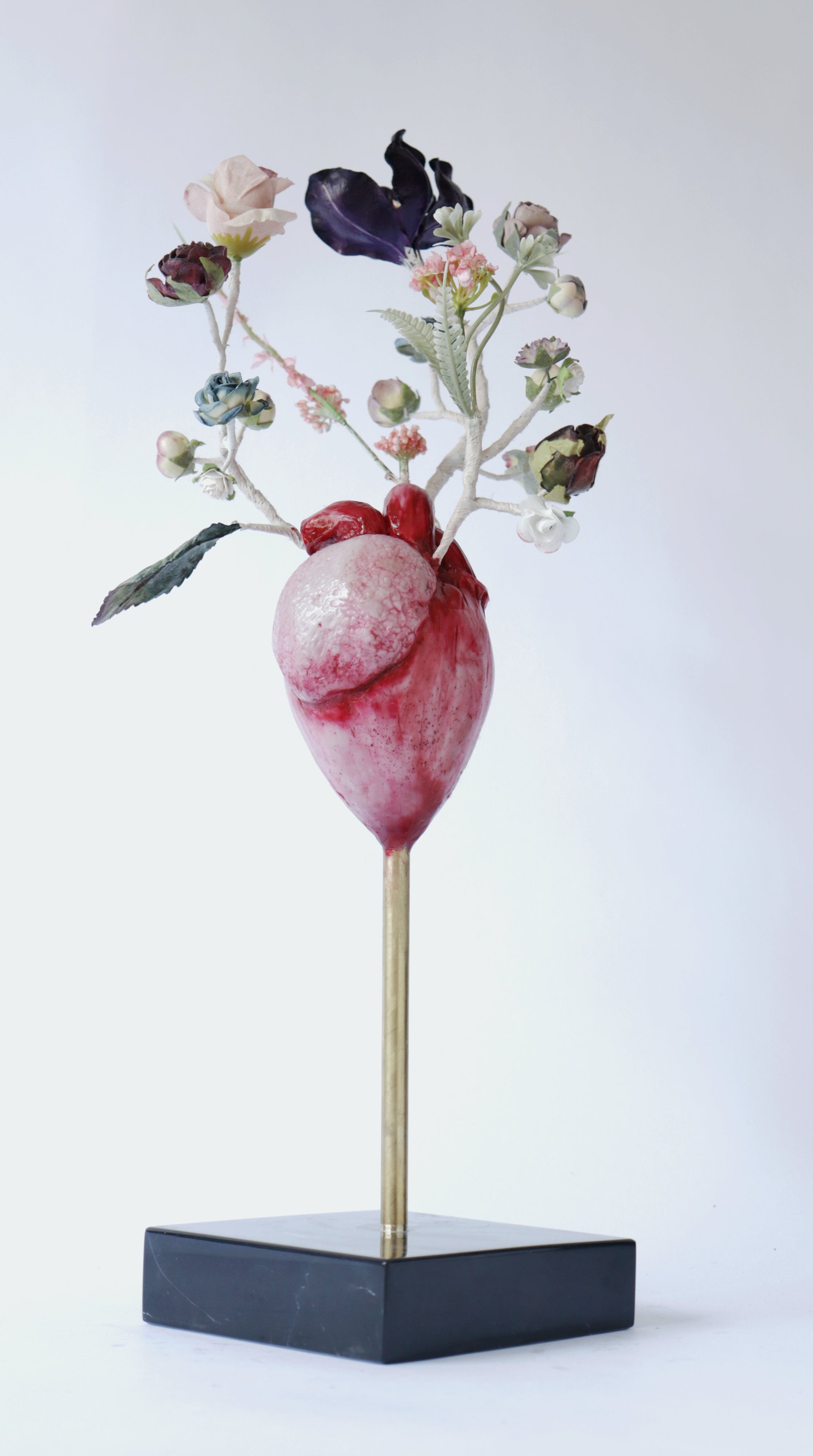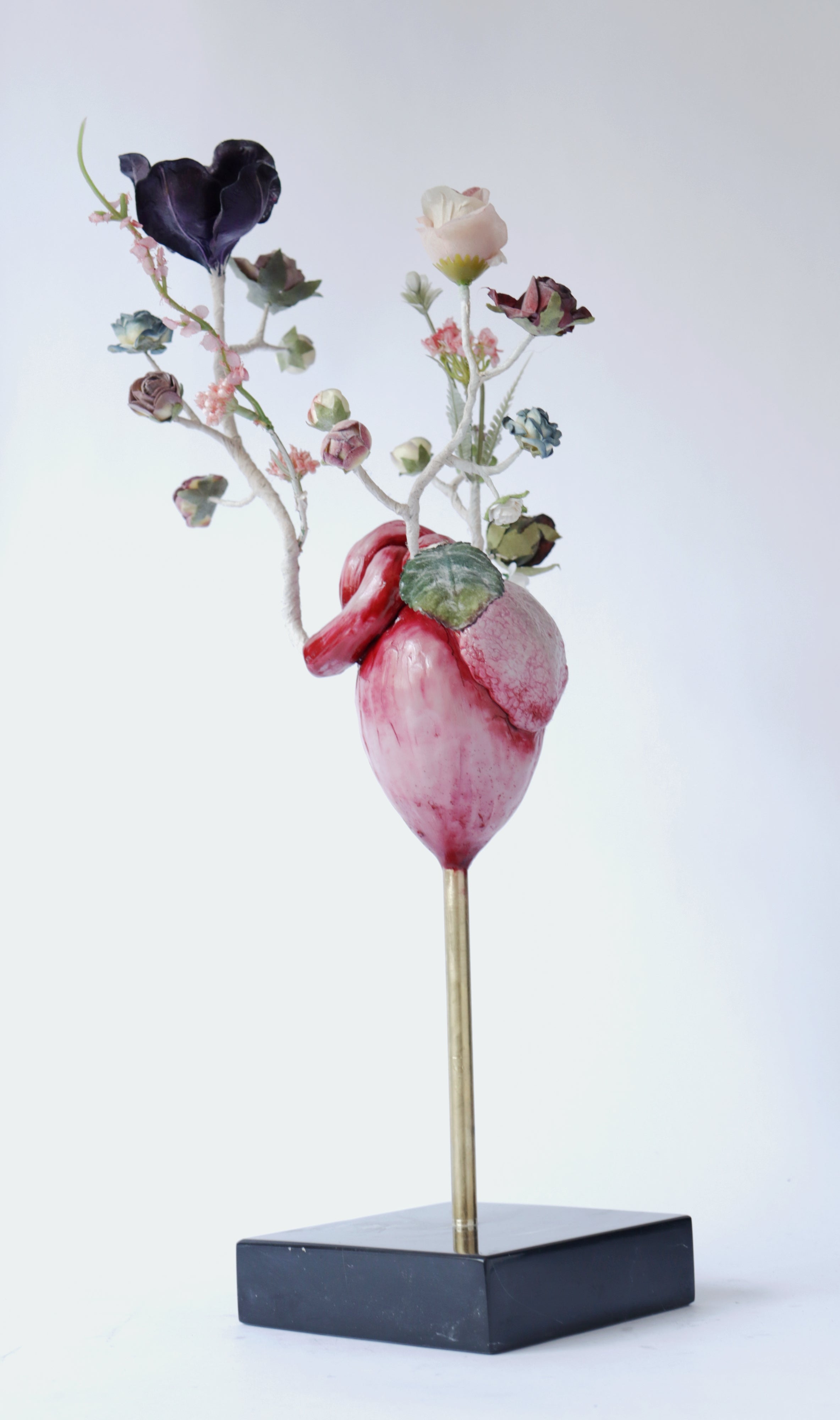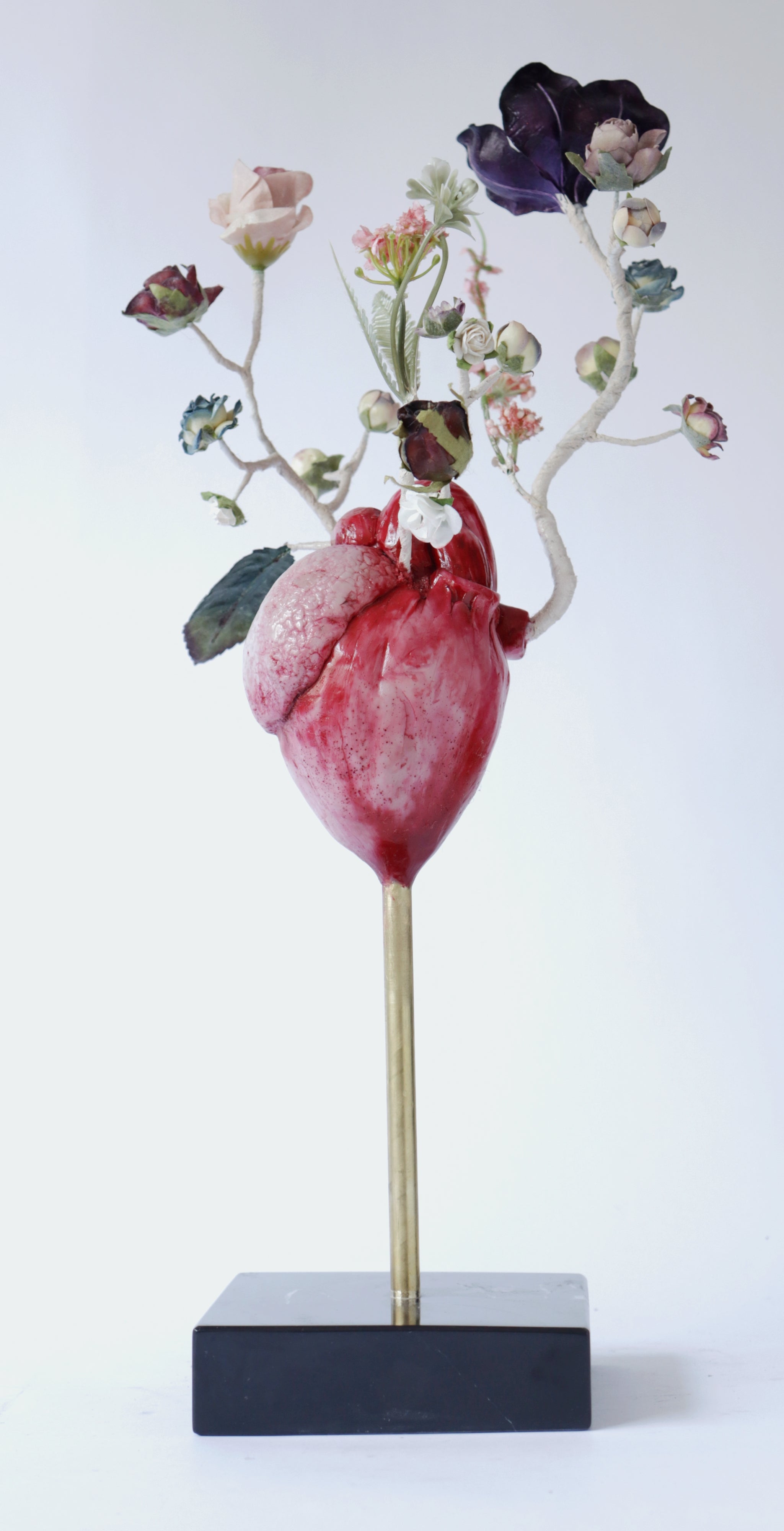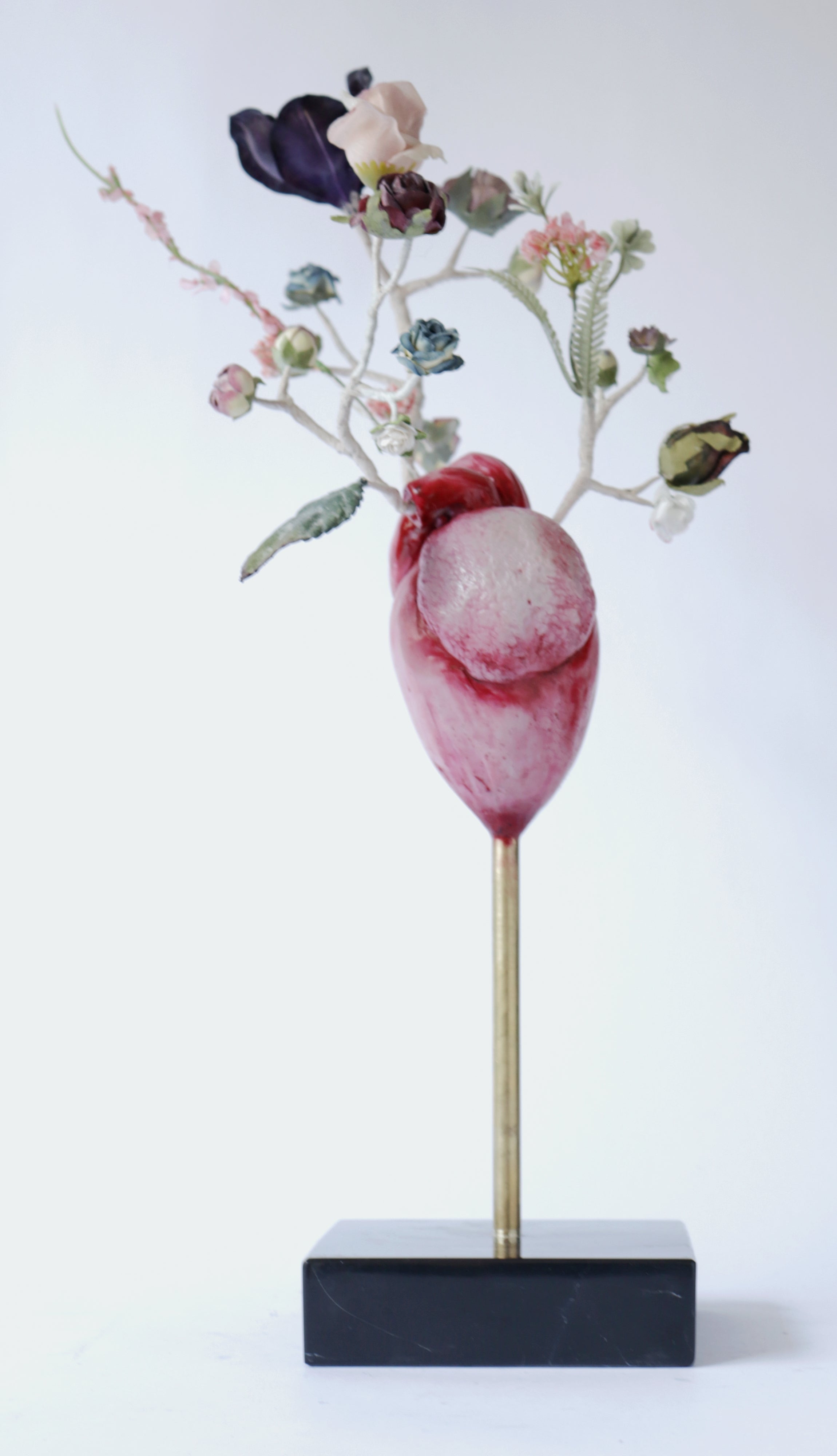 The piece depicts a human heart sculpted in resin, from which delicate branches and flowers rise. It evokes the slow, intimate process of growth and the quiet unfolding of self-love, as if the heart itself were learning to bloom.