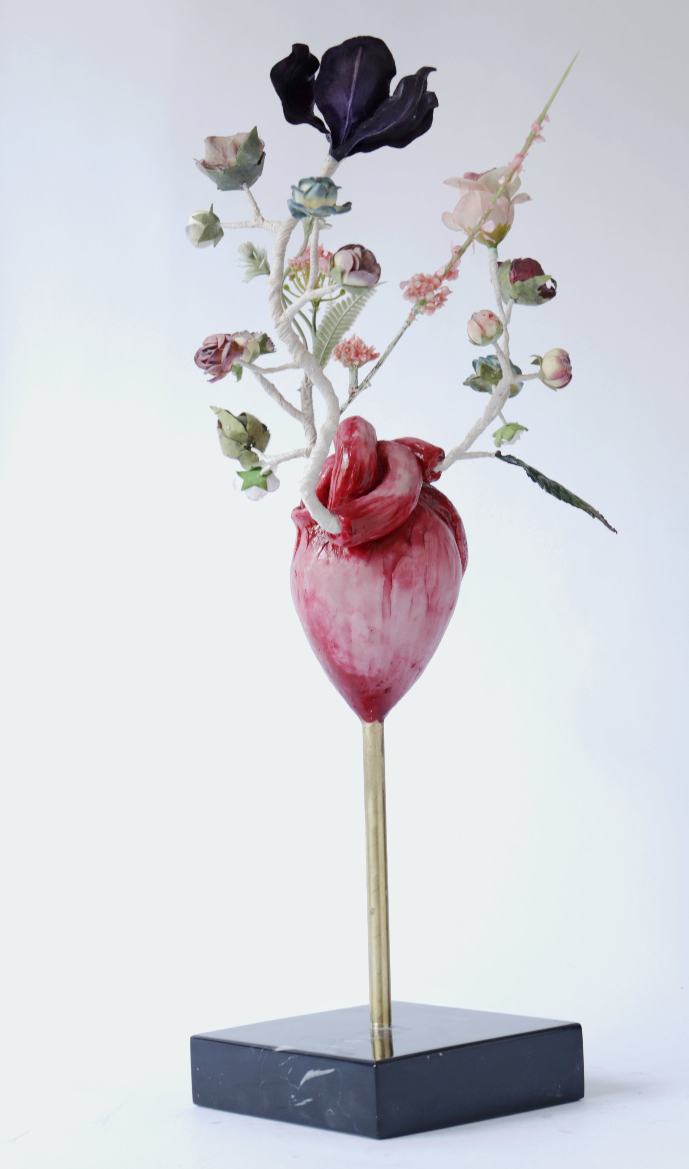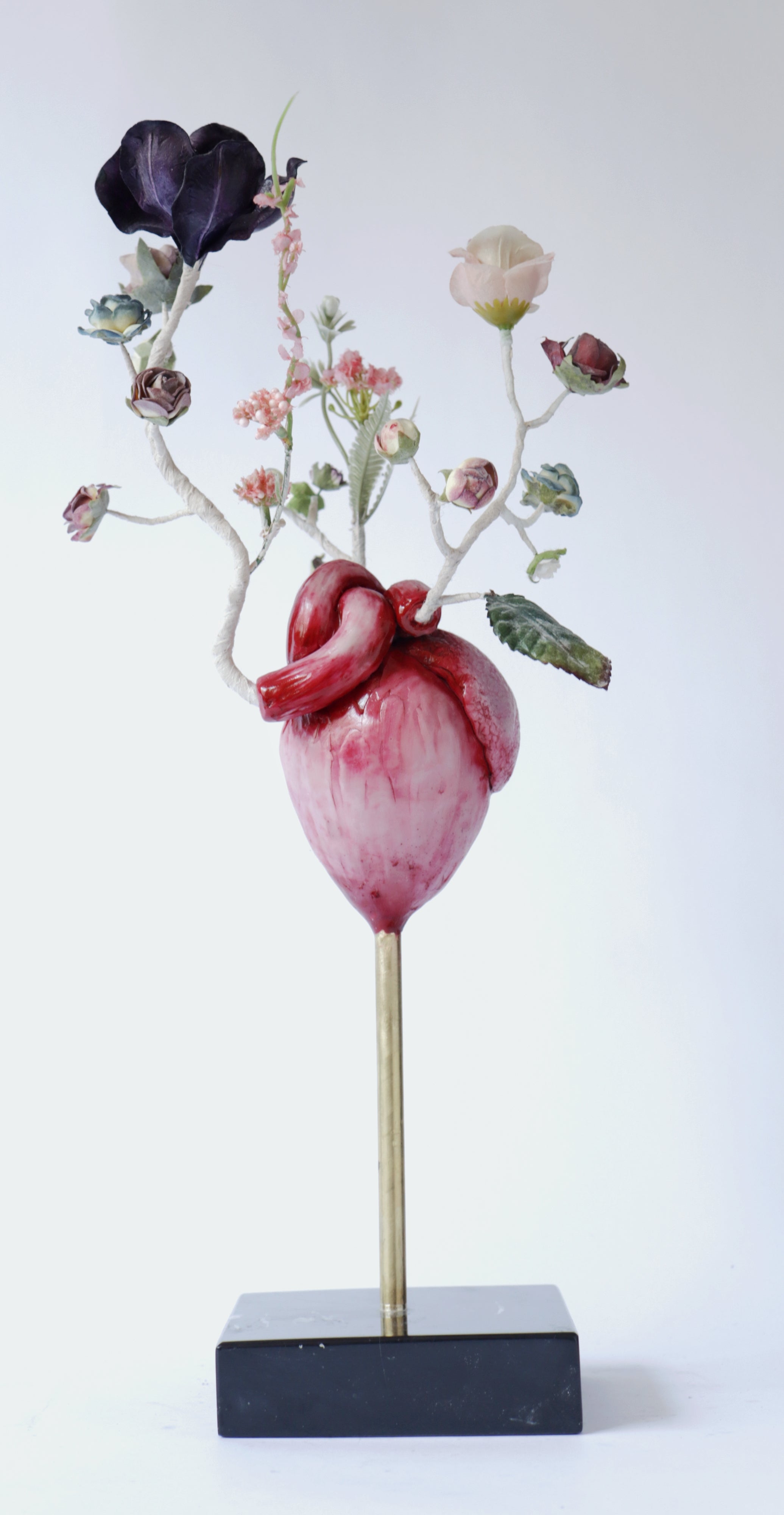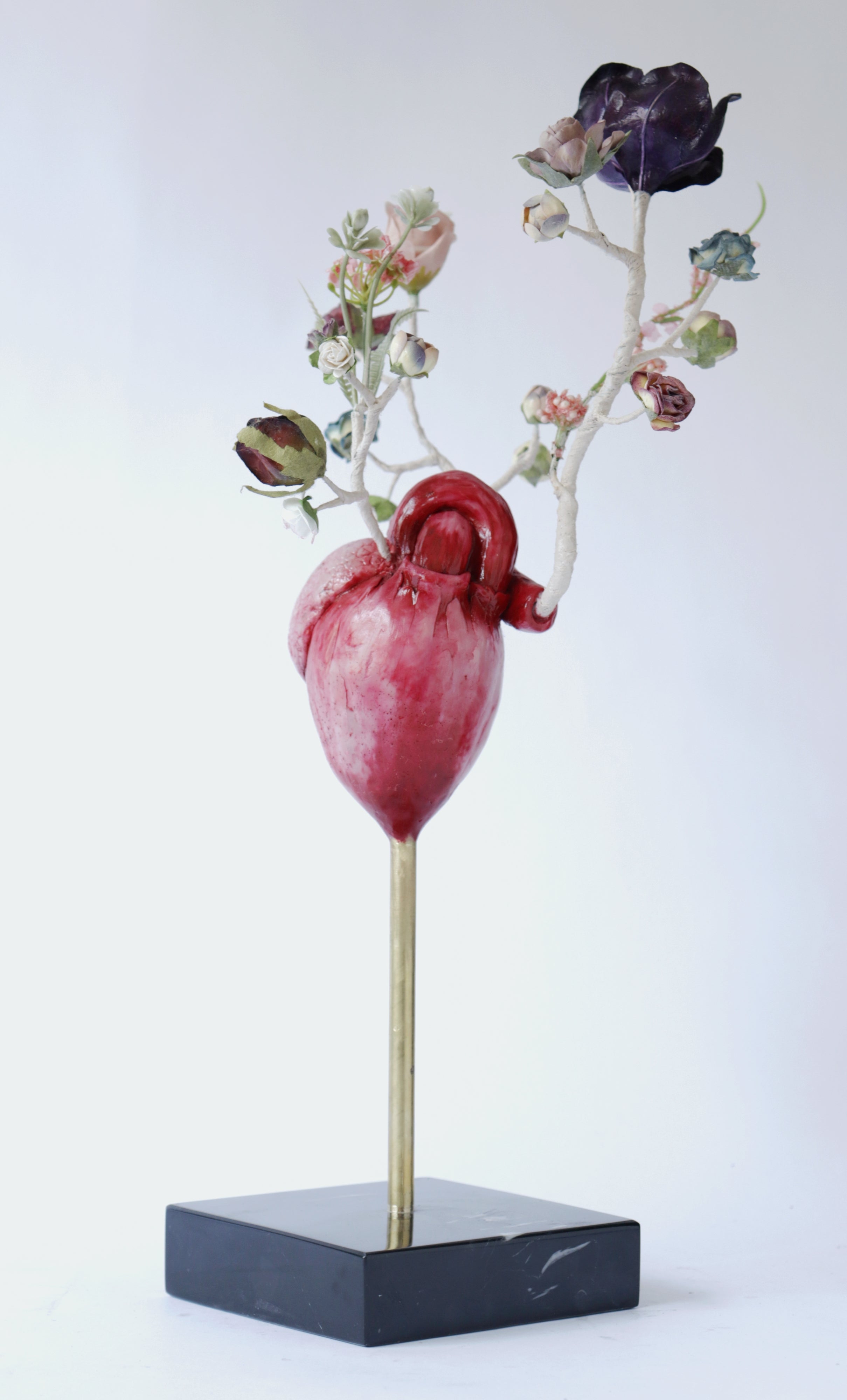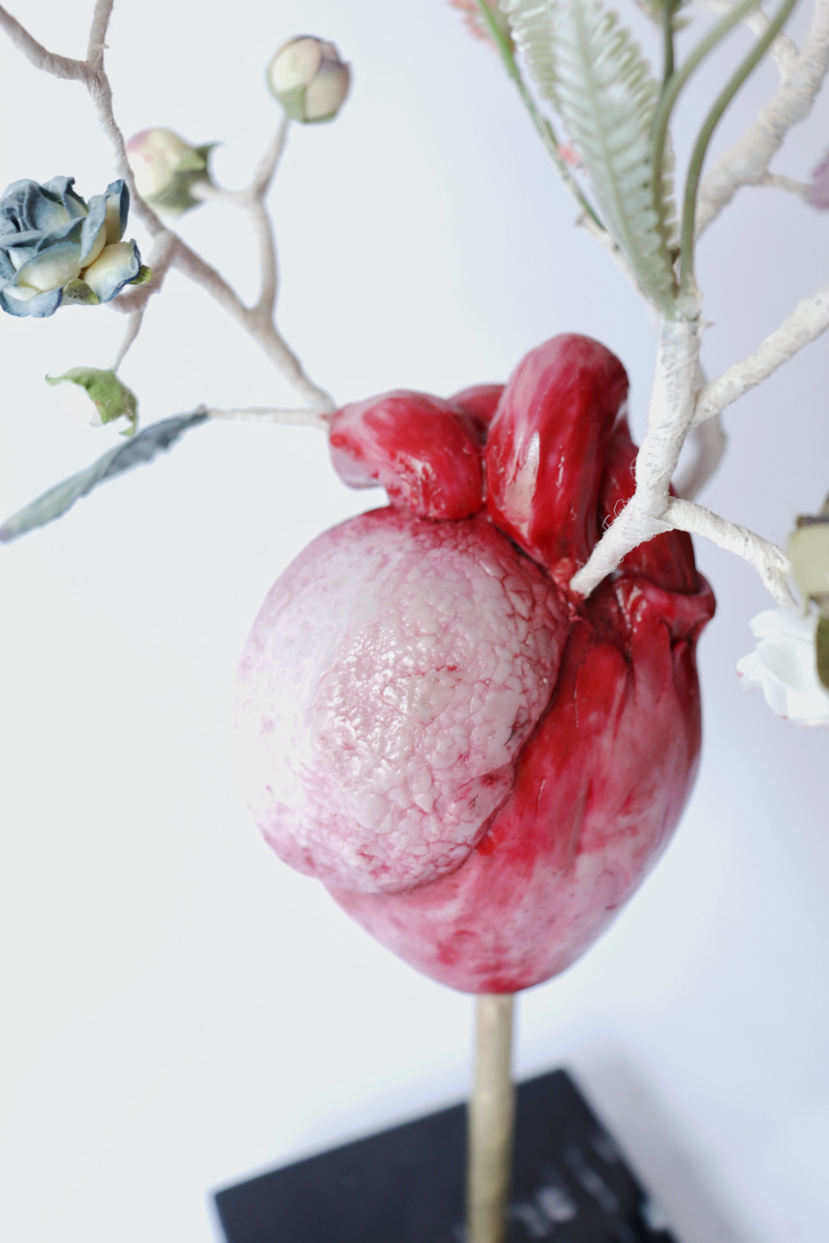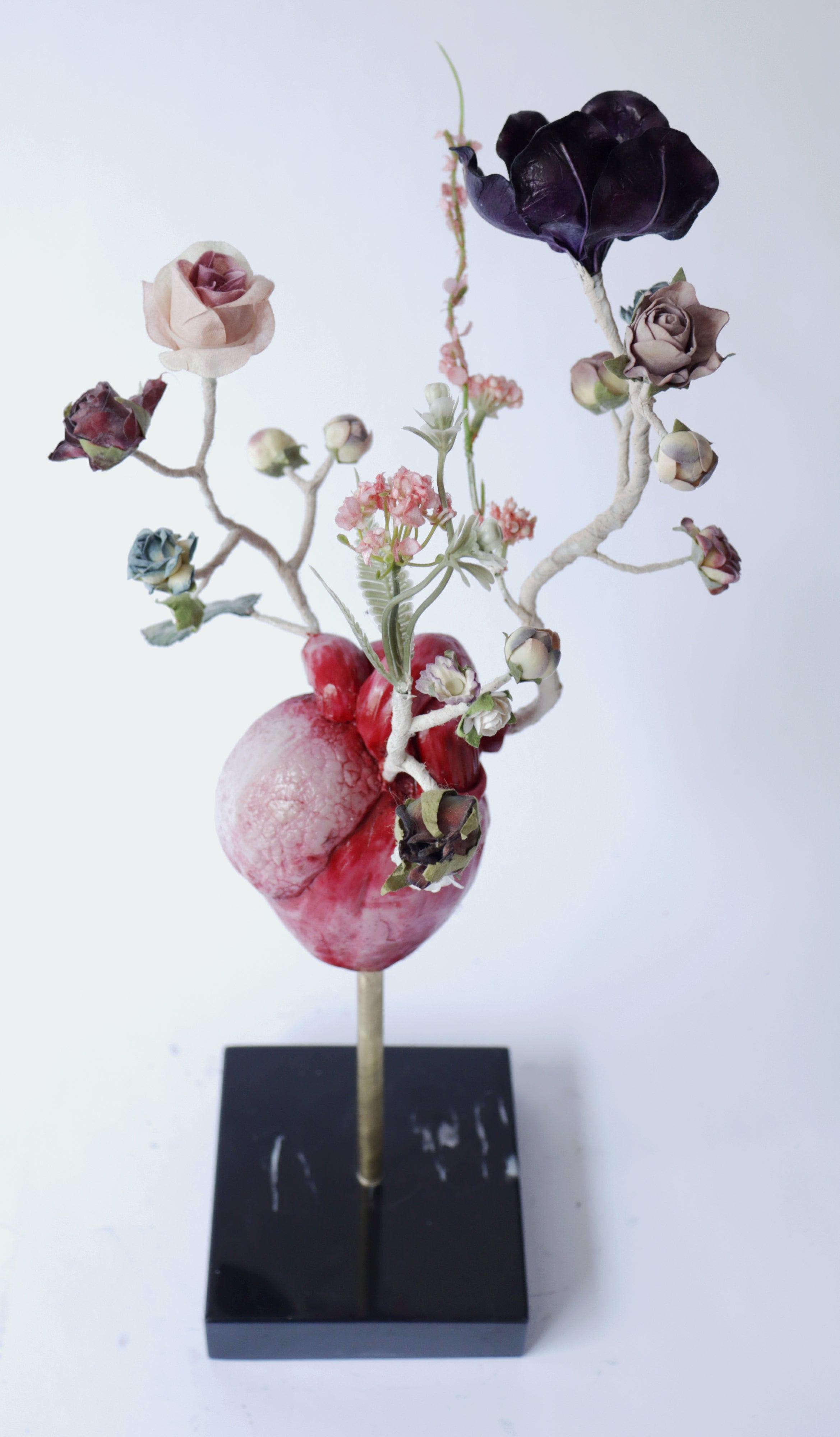 The piece depicts a human heart sculpted in resin, from which delicate branches and flowers rise. It evokes the slow, intimate process of growth and the quiet unfolding of self-love, as if the heart itself were learning to bloom.