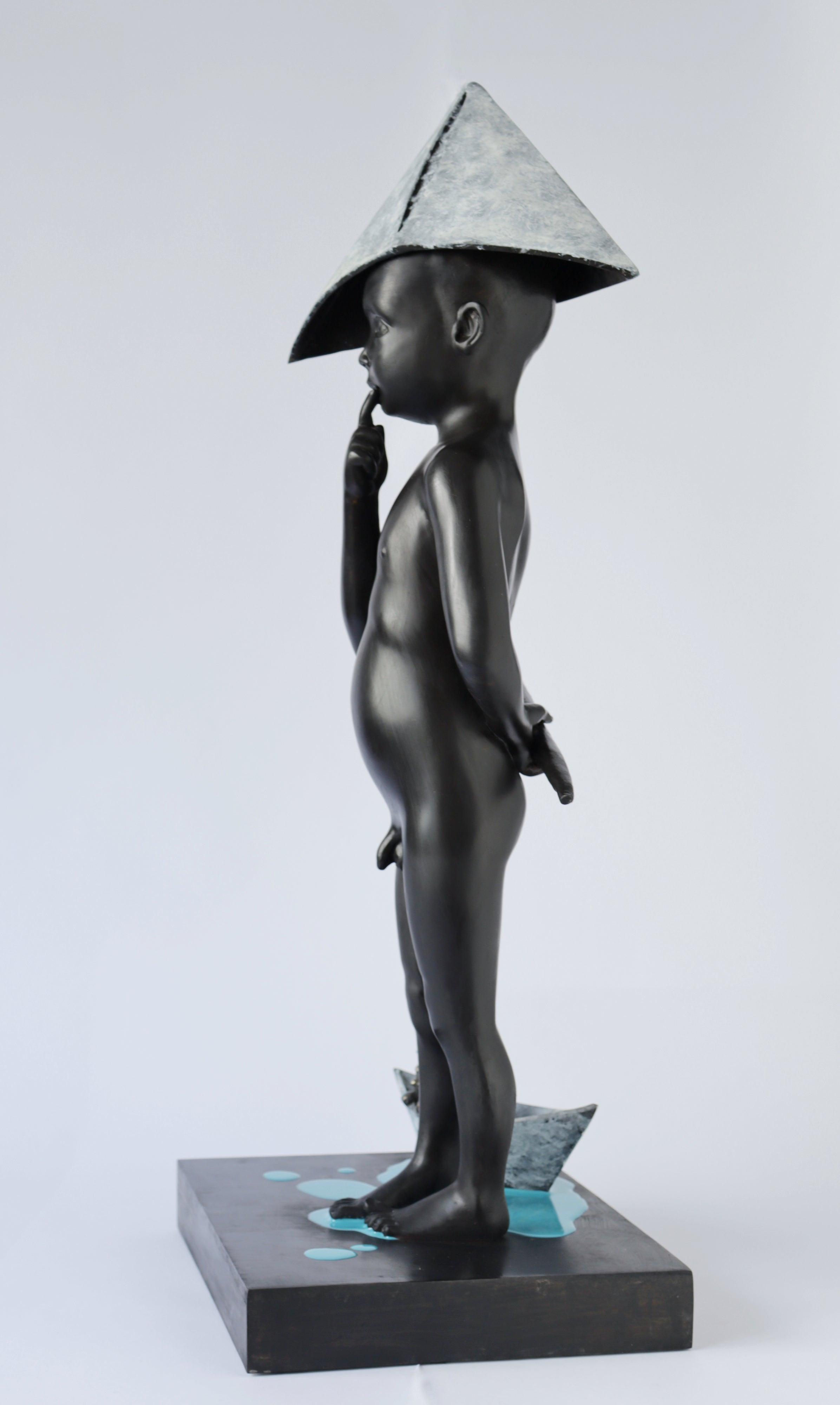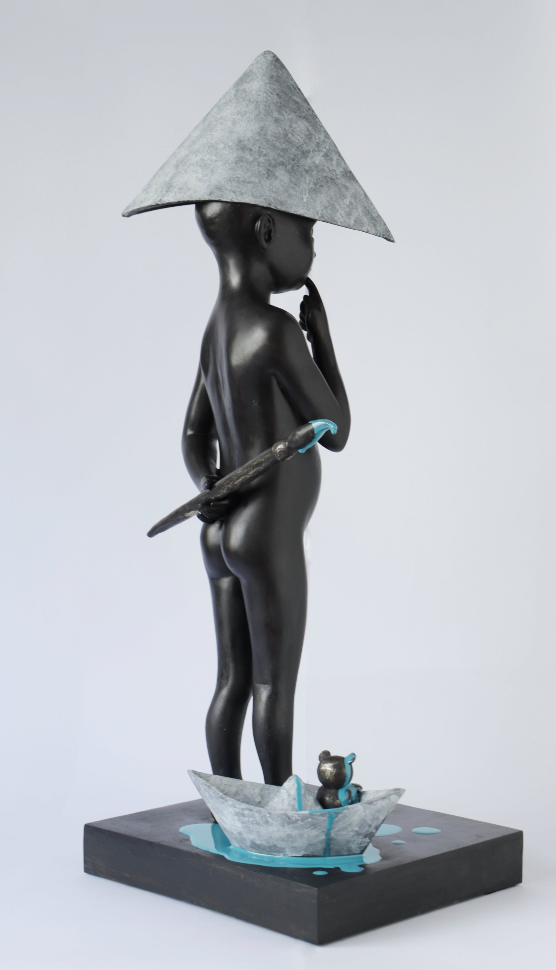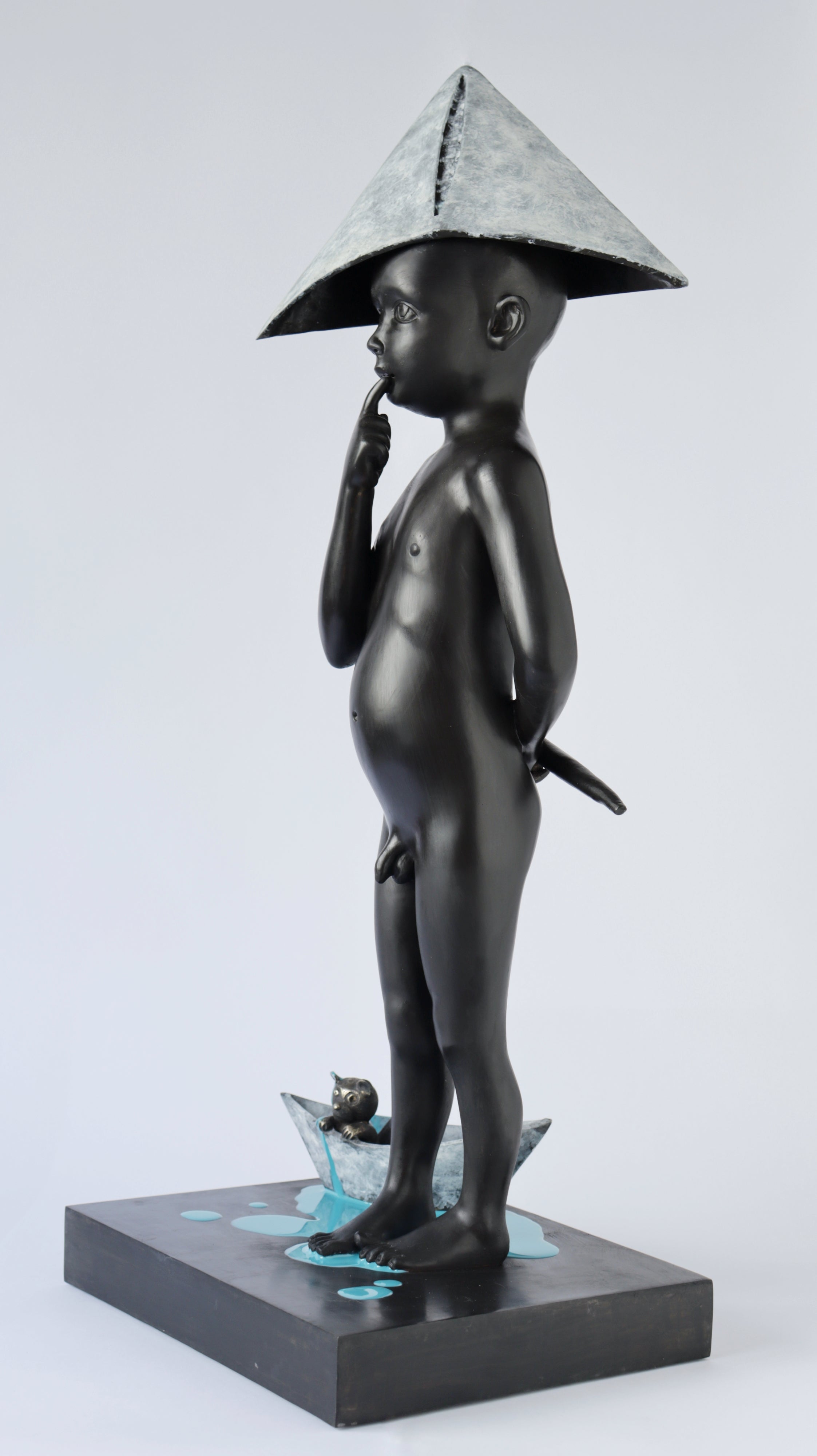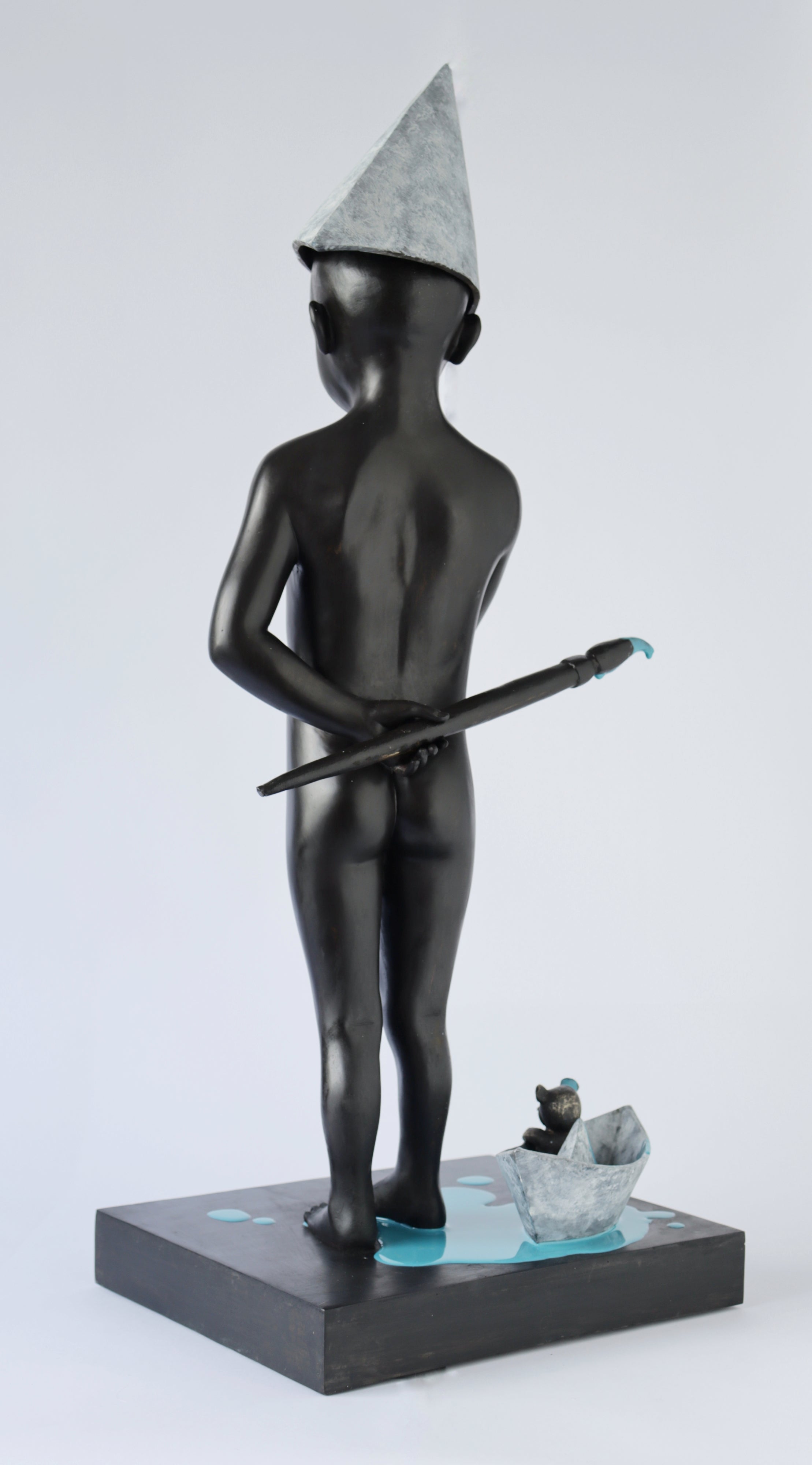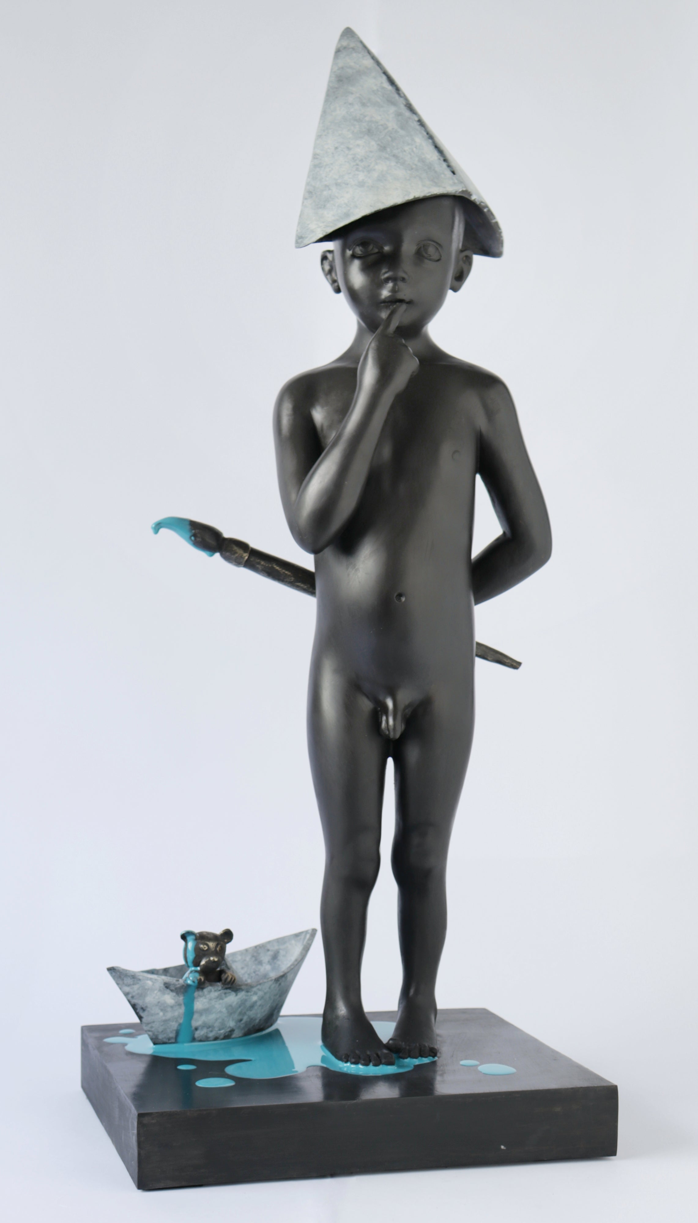 Il Capitano is a bronze sculpture depicting a young boy caught in the middle of mischief—he has painted the floor. Wearing a paper hat, he stands with one finger to his lips while hiding a paintbrush behind his back. A small bear floats nearby in a paper boat on a puddle of blue paint, as he plays at being a captain.