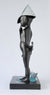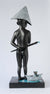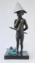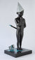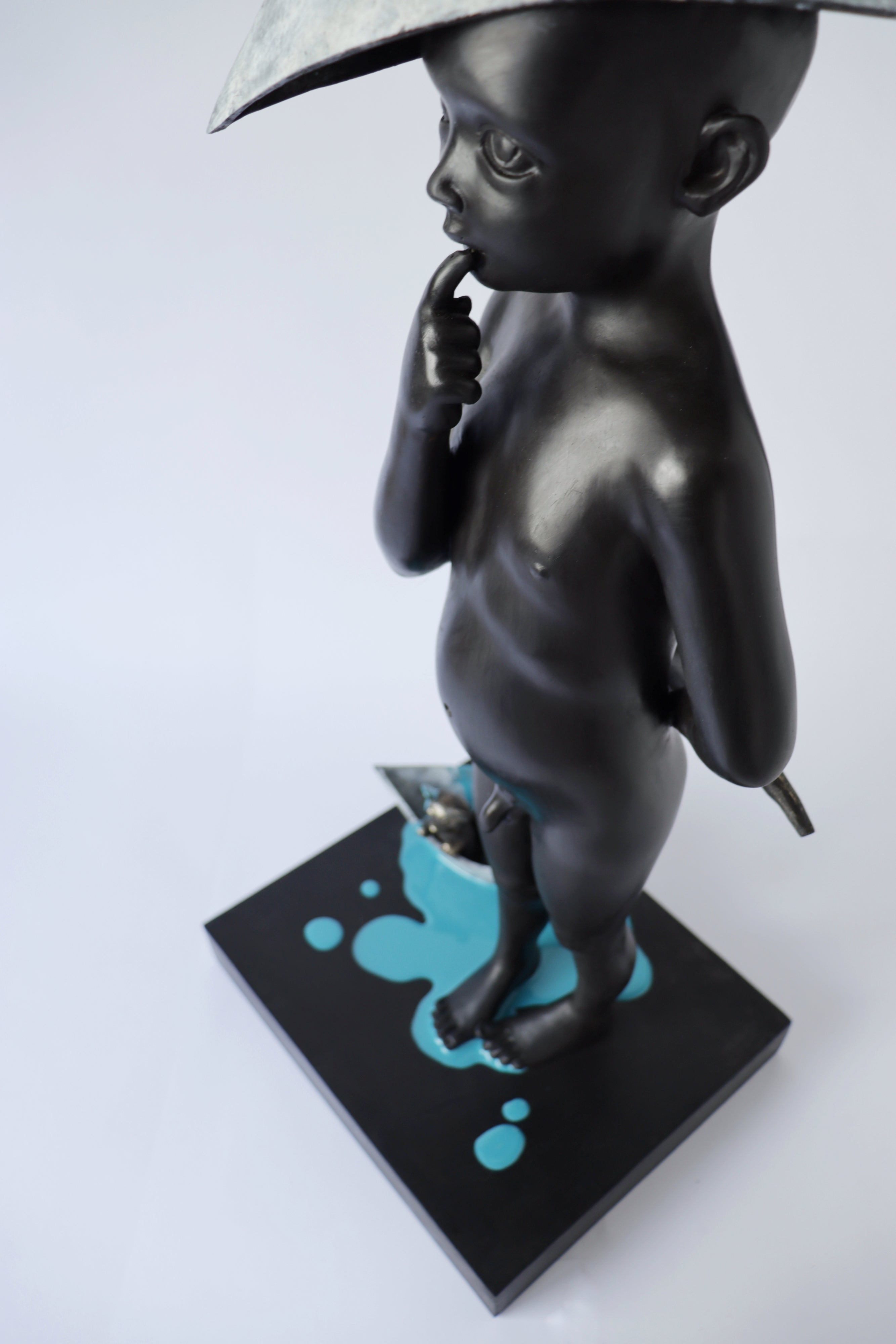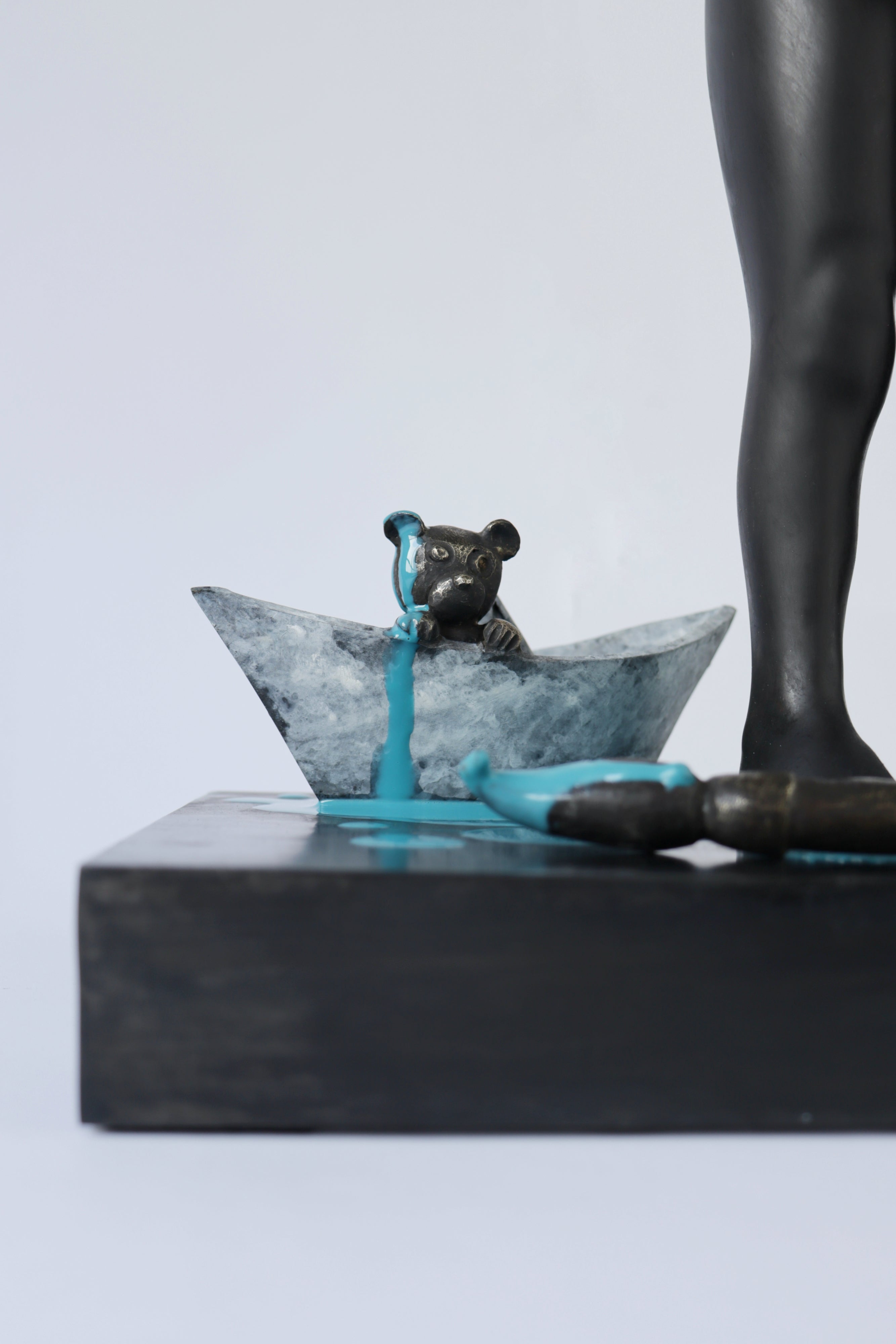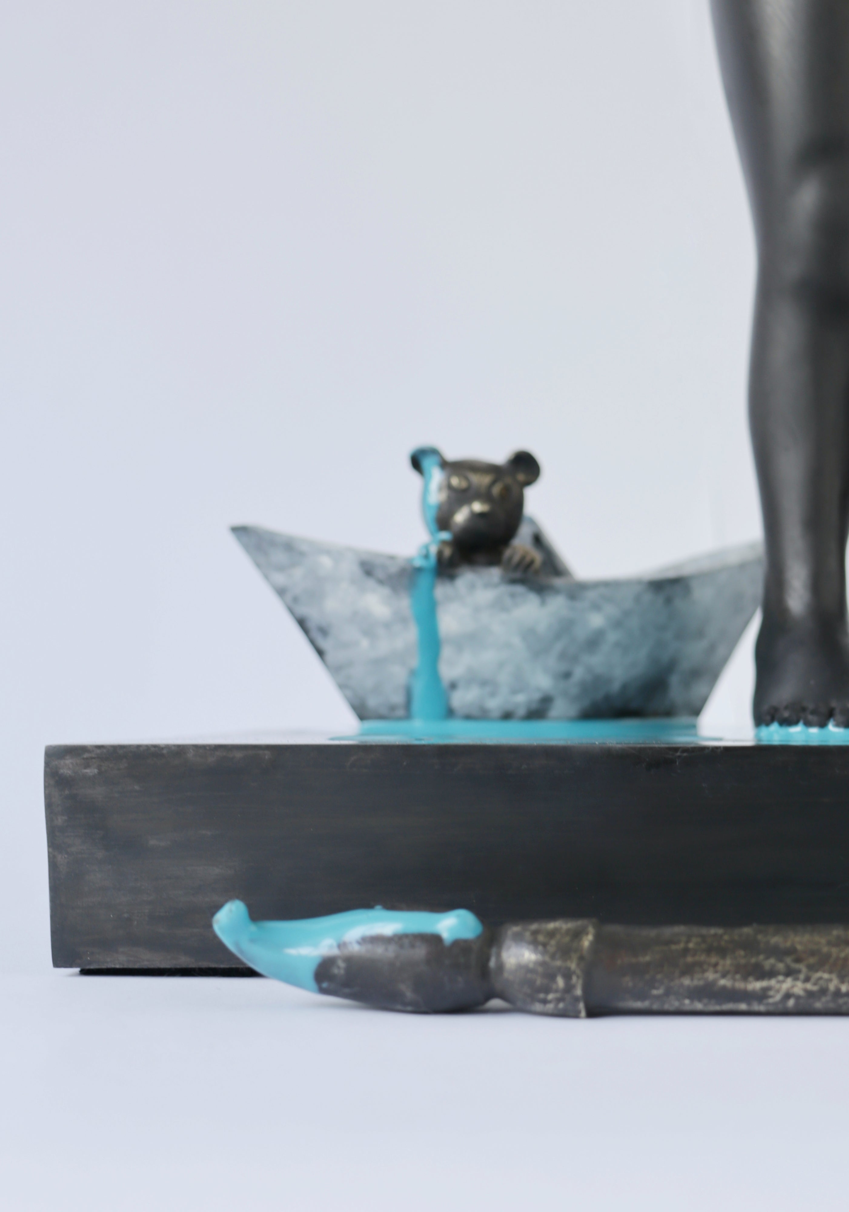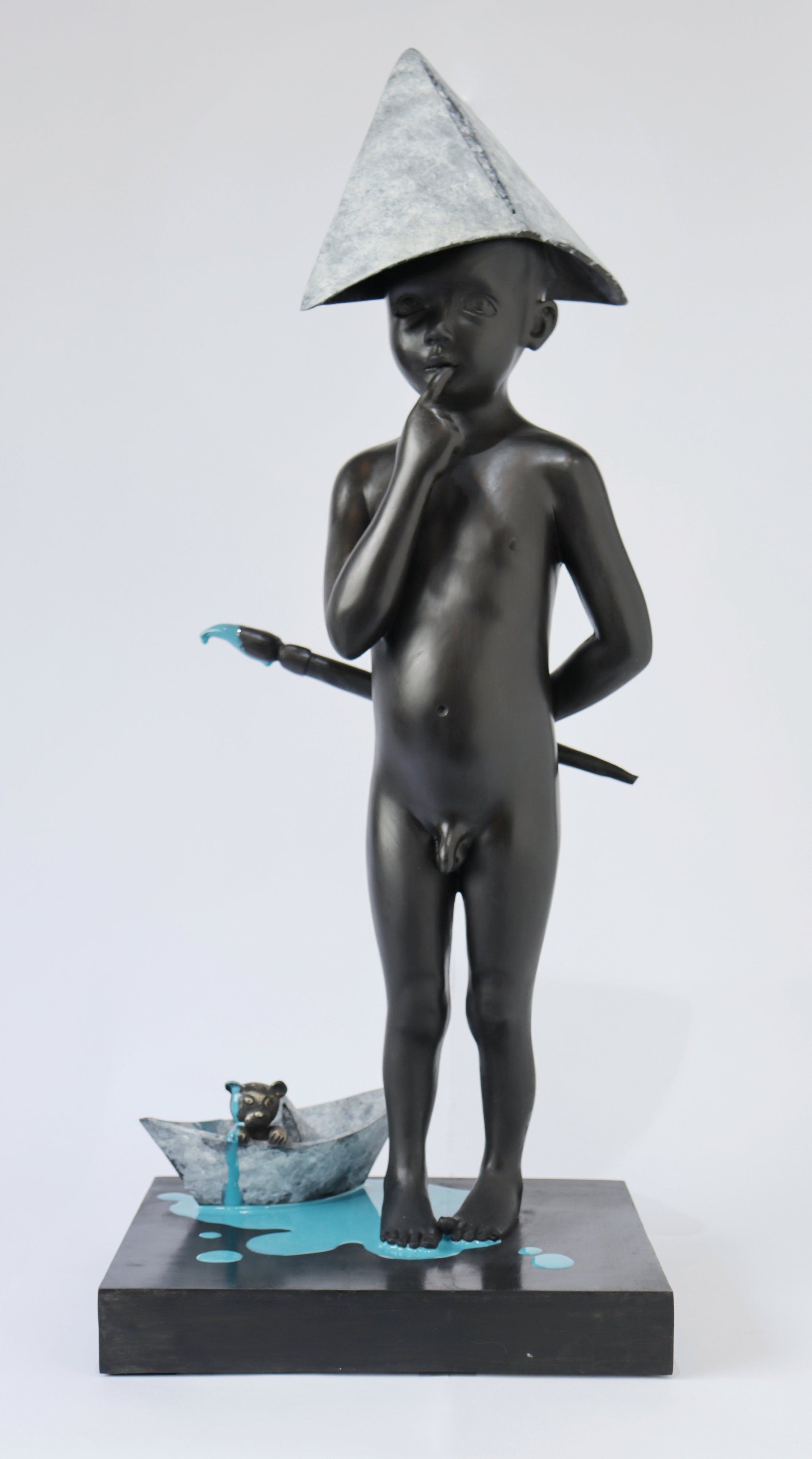 Il Capitano is a bronze sculpture depicting a young boy caught in the middle of mischief—he has painted the floor. Wearing a paper hat, he stands with one finger to his lips while hiding a paintbrush behind his back. A small bear floats nearby in a paper boat on a puddle of blue paint, as he plays at being a captain.