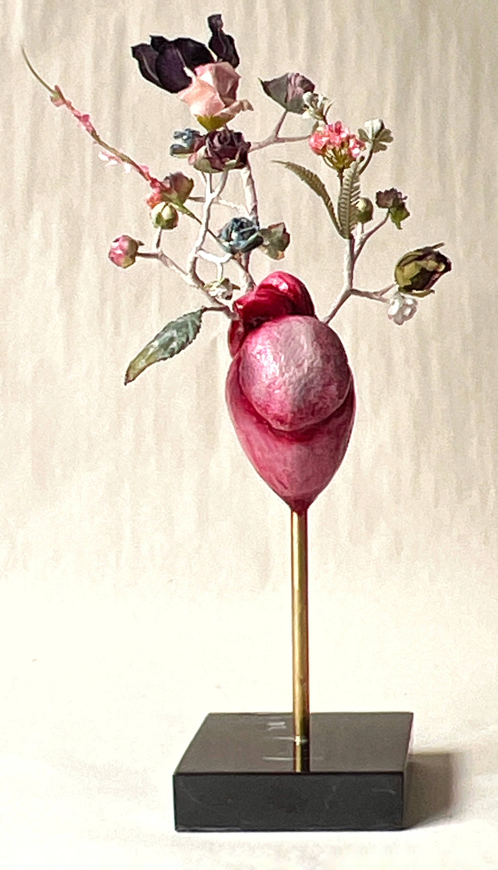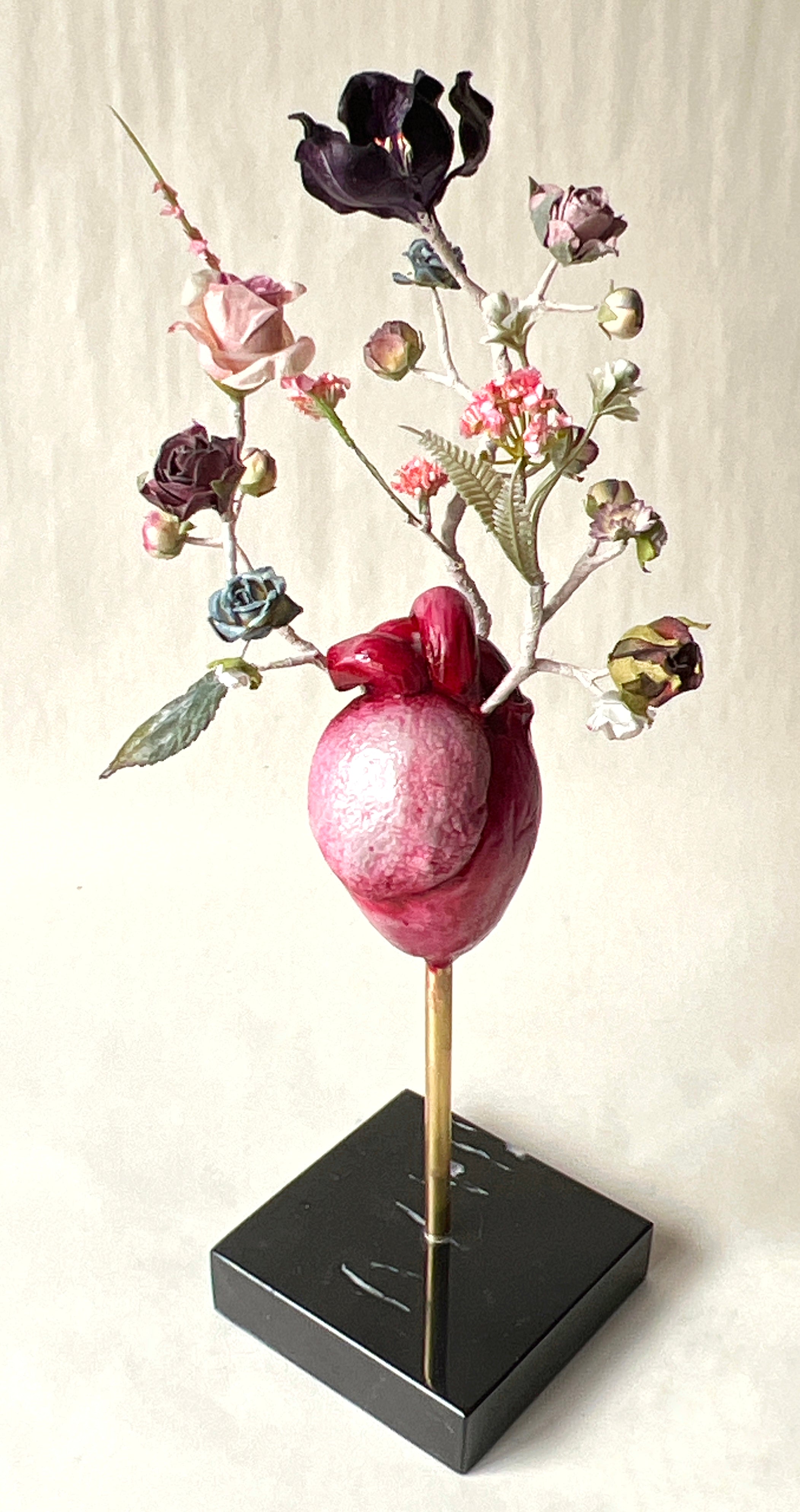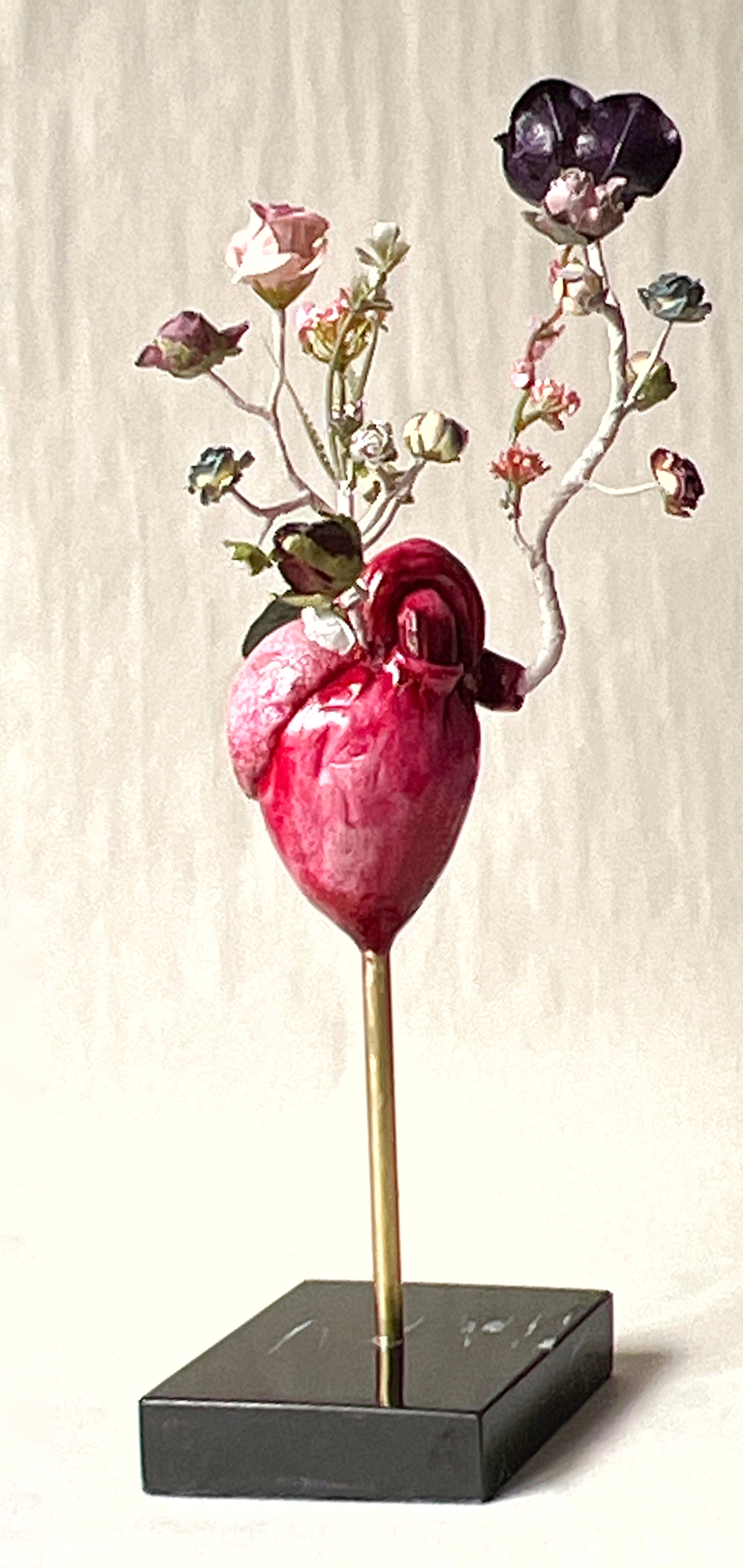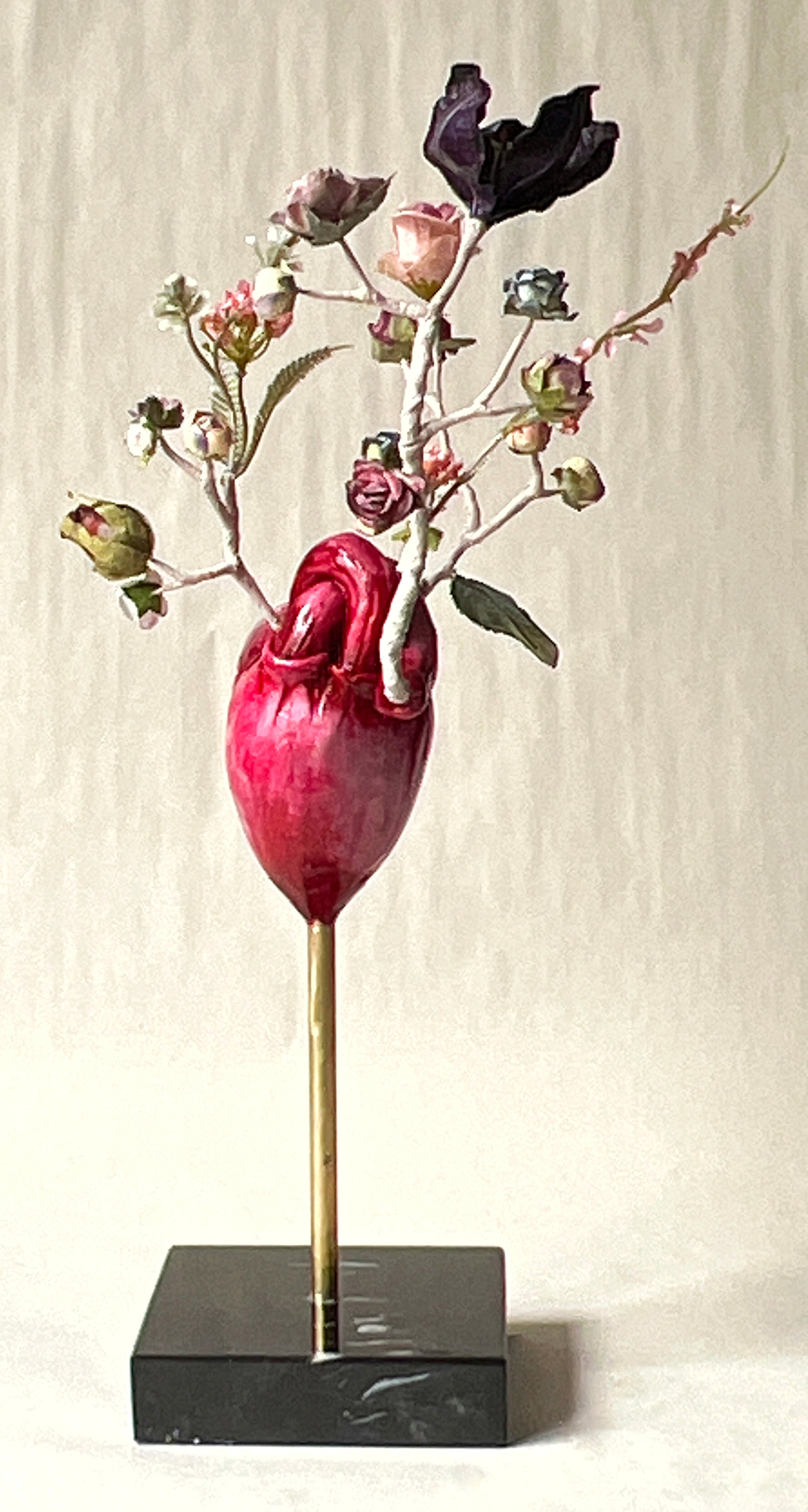 The piece depicts a human heart sculpted in resin, from which delicate branches and flowers rise. It evokes the slow, intimate process of growth and the quiet unfolding of self-love, as if the heart itself were learning to bloom.