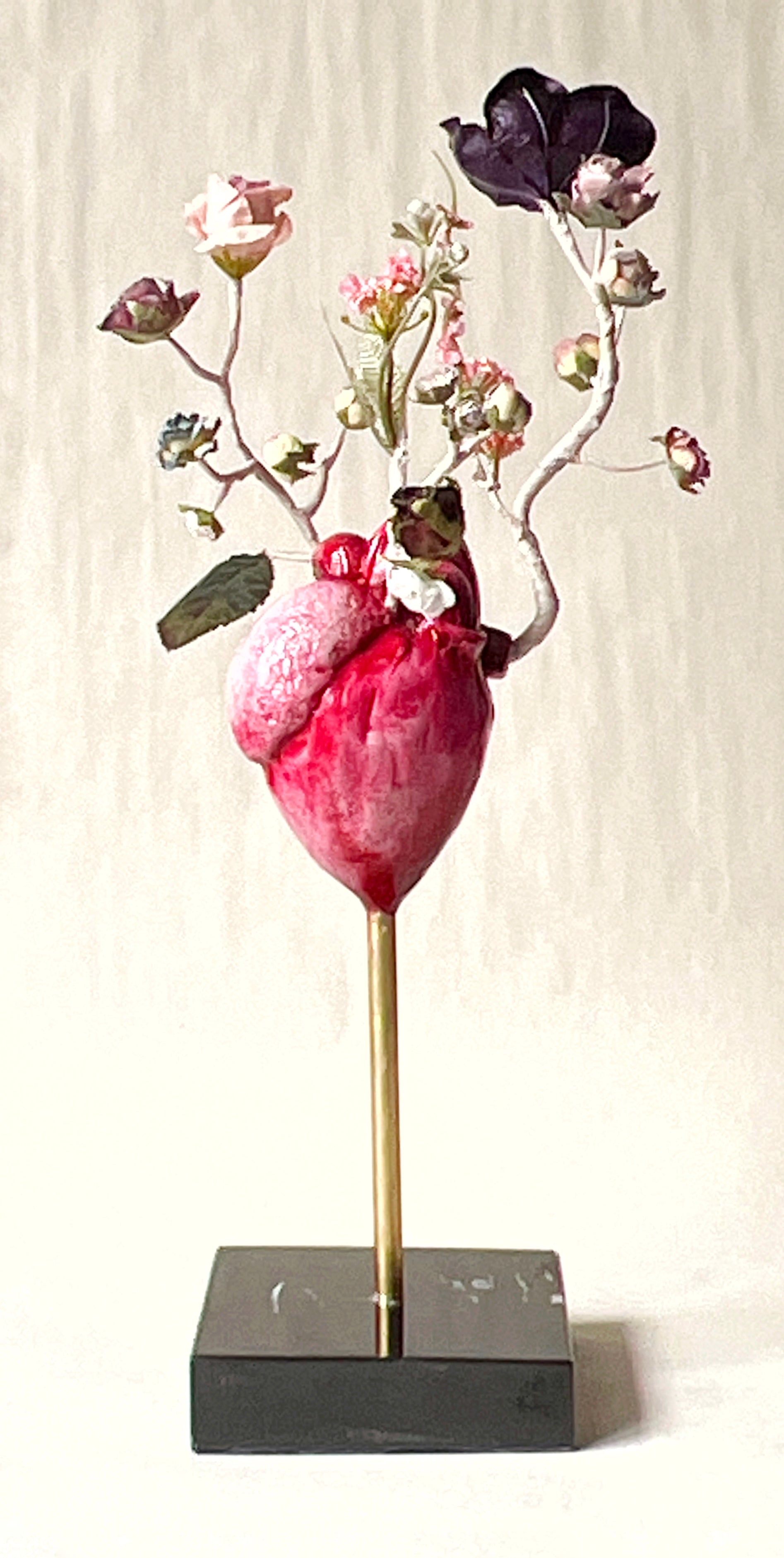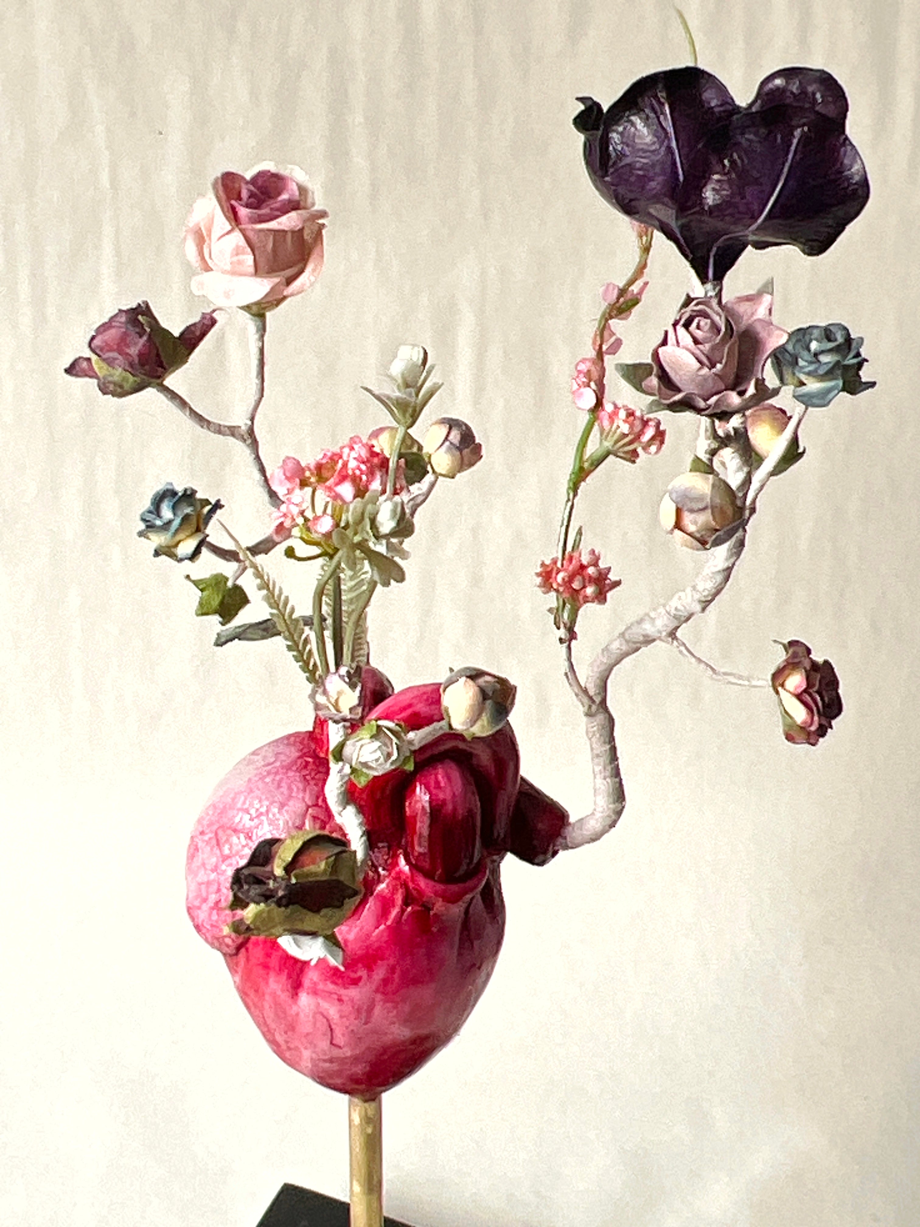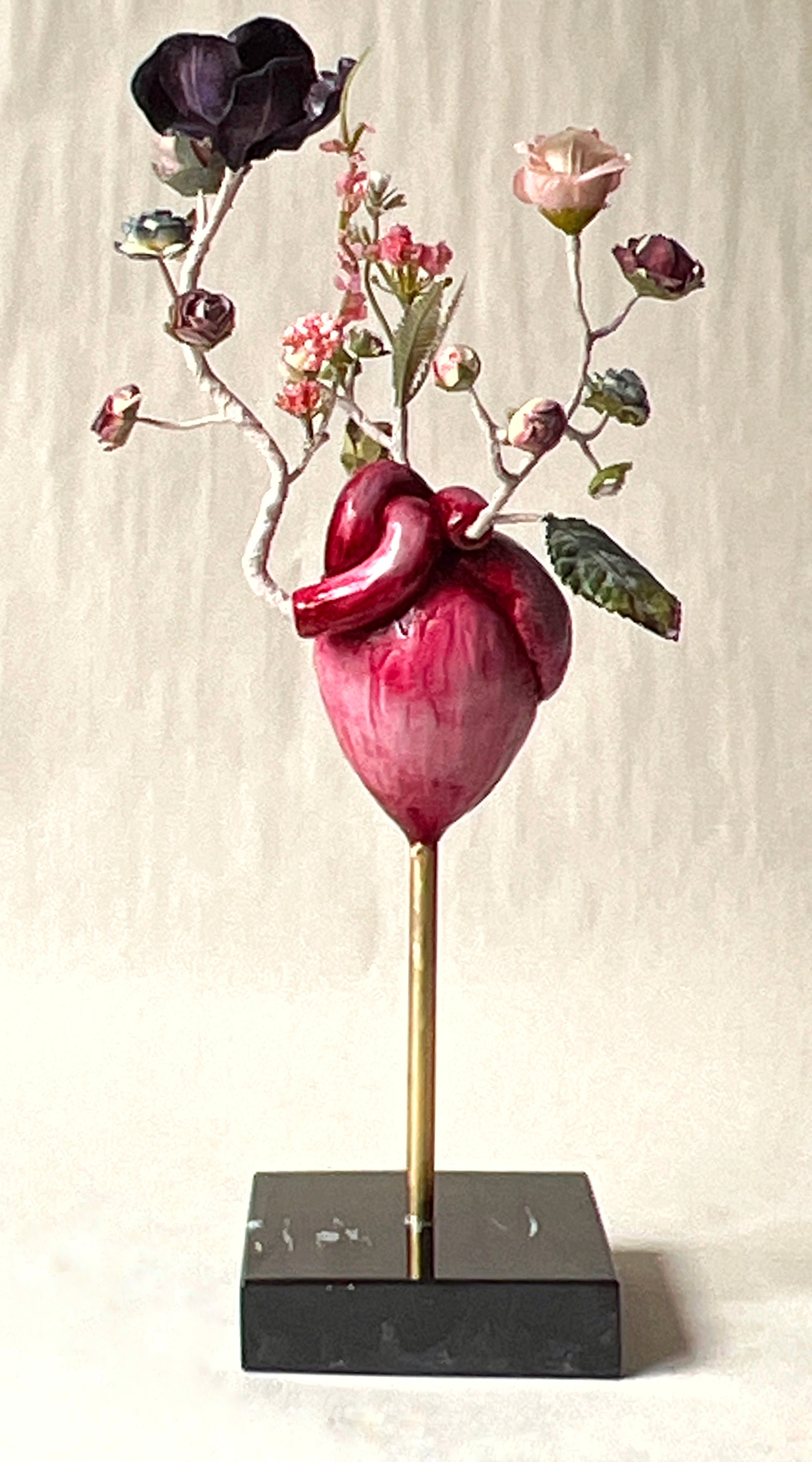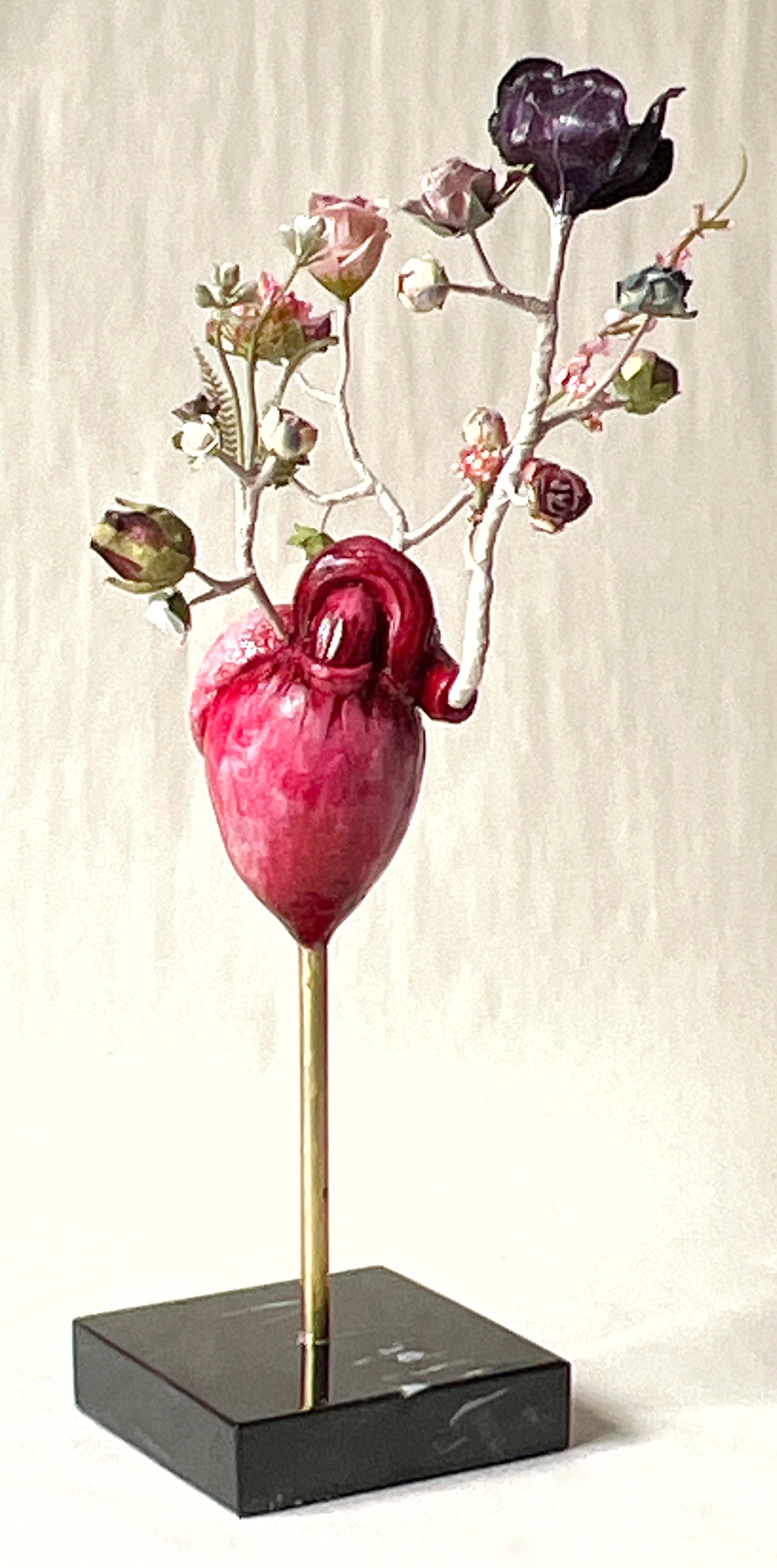 The piece depicts a human heart sculpted in resin, from which delicate branches and flowers rise. It evokes the slow, intimate process of growth and the quiet unfolding of self-love, as if the heart itself were learning to bloom.