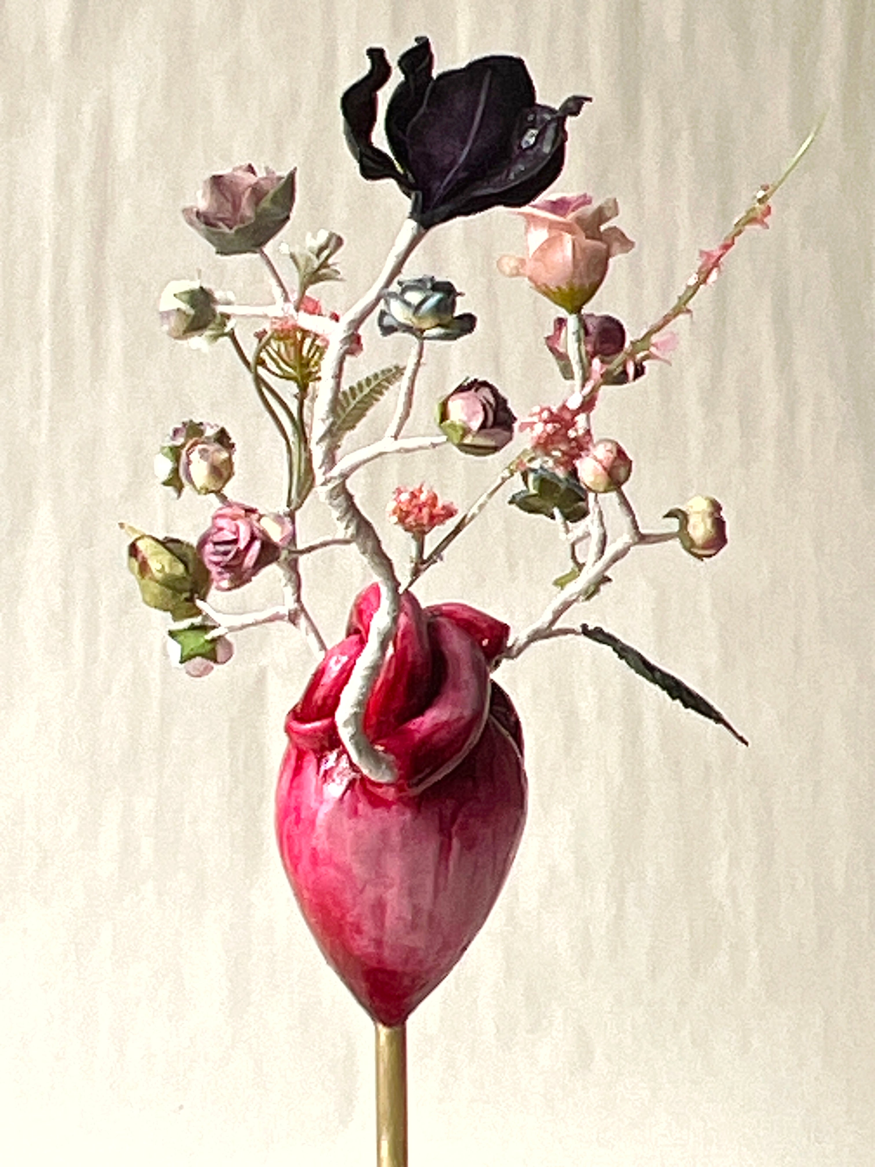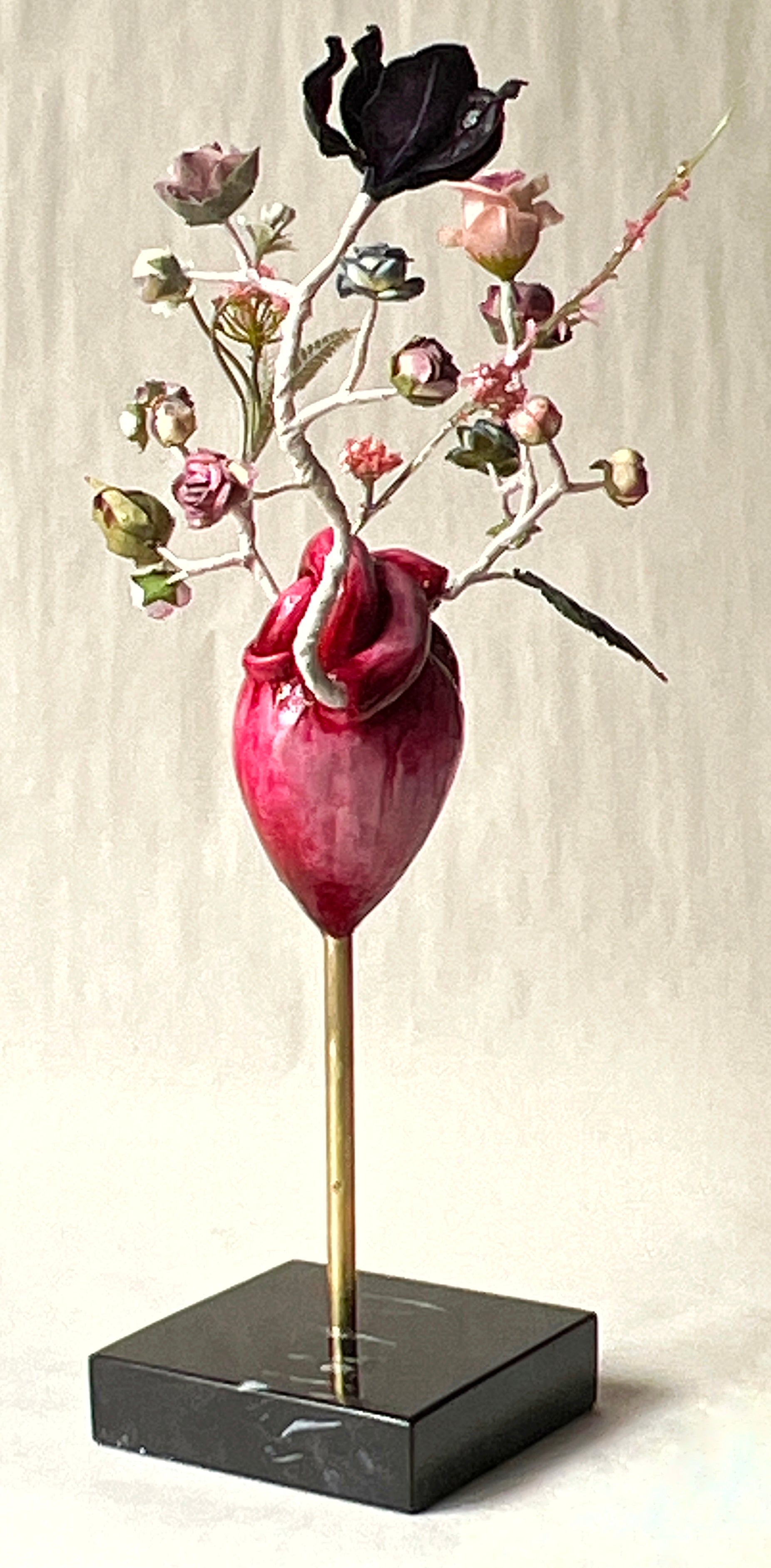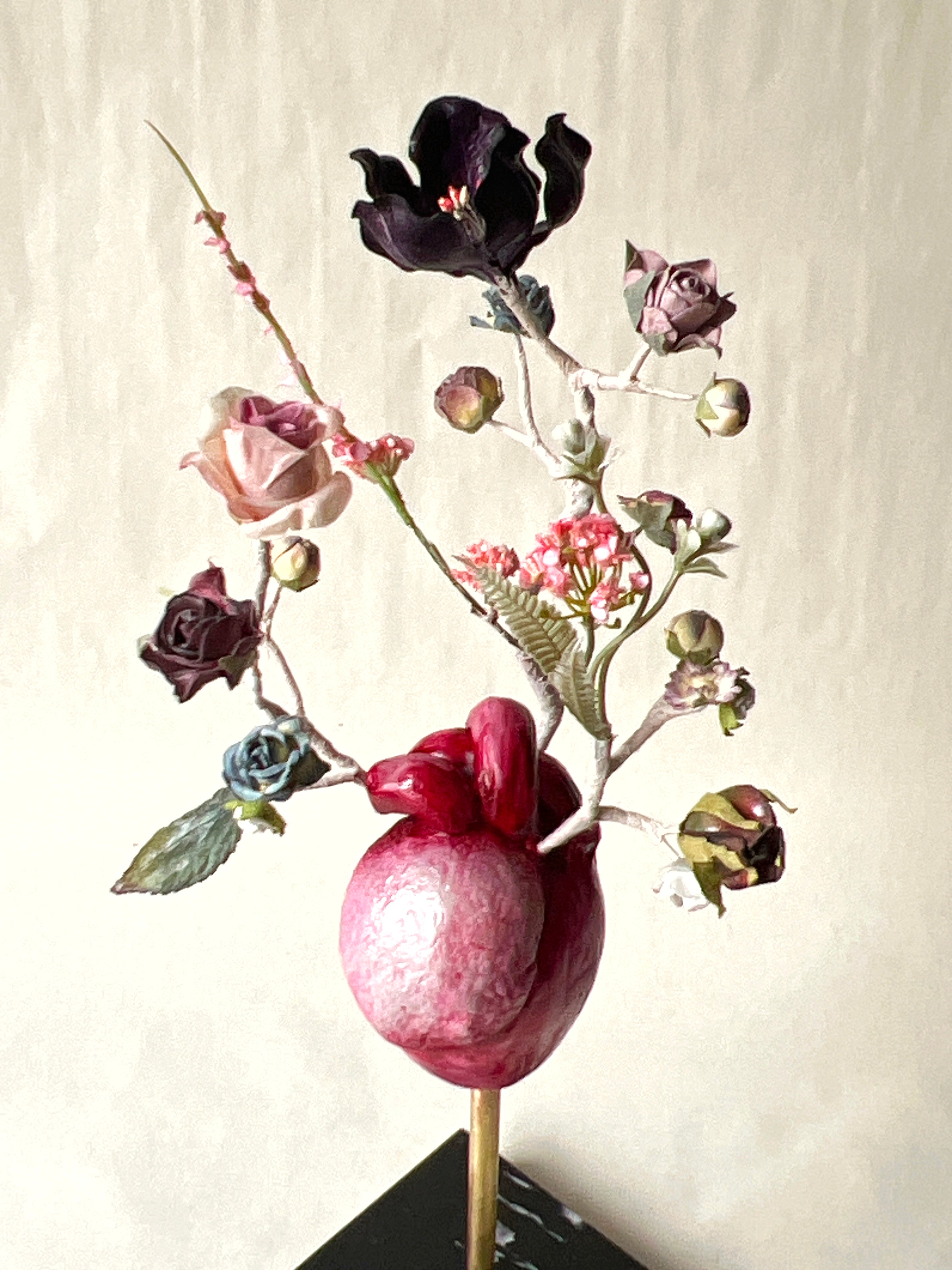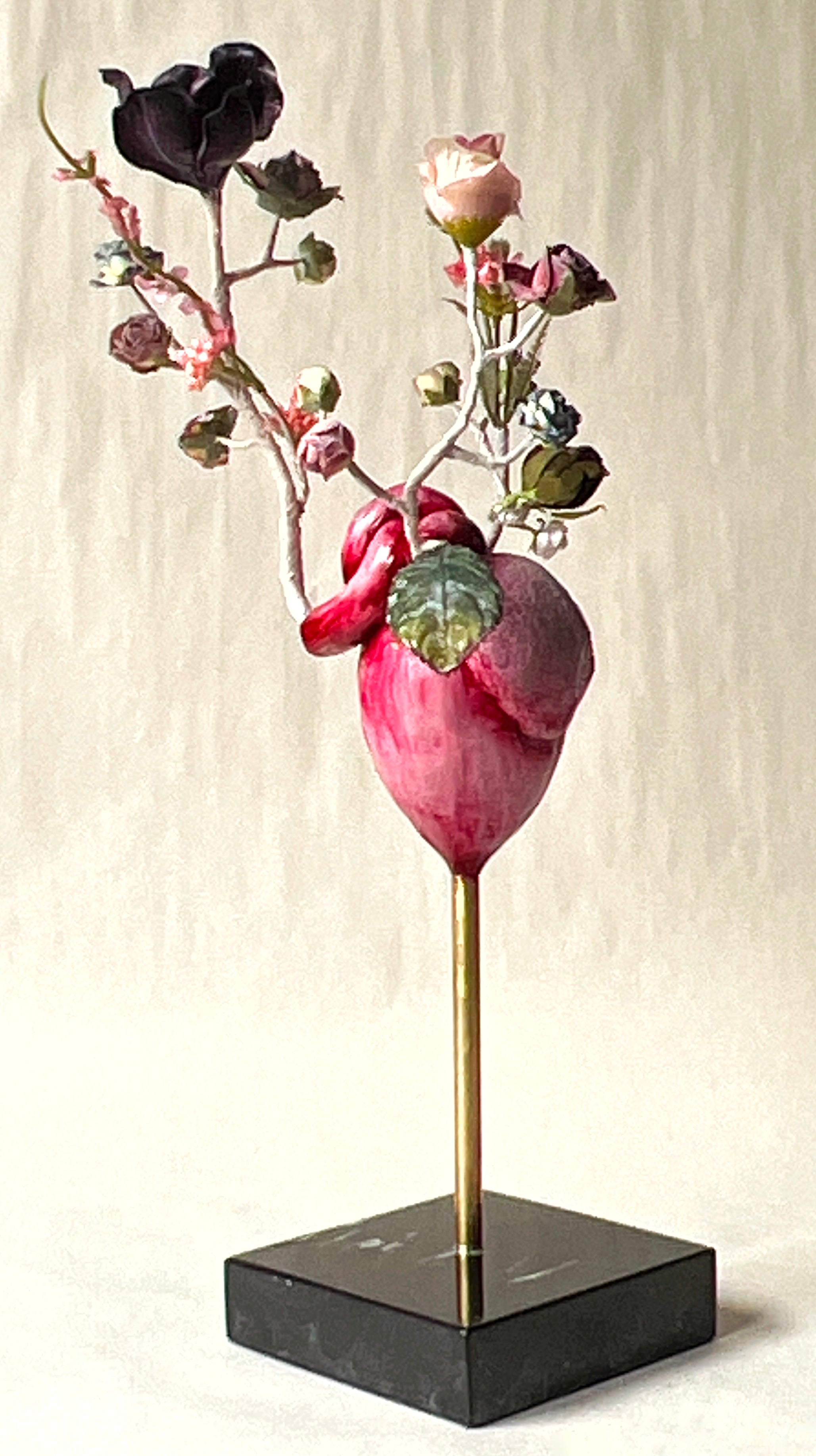 The piece depicts a human heart sculpted in resin, from which delicate branches and flowers rise. It evokes the slow, intimate process of growth and the quiet unfolding of self-love, as if the heart itself were learning to bloom.