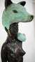 FOXY is a bronze sculpture of a woman with a foxy mask or hat and a small fox on her feet.