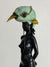 READY TO FLY is a bronze sculpture of a woman with a bird mask or hat.
